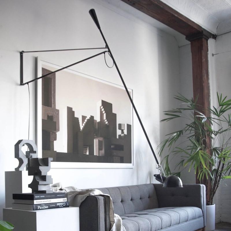 Lámpara con brazo regulable de acero pintado y reflector. Soporte reflector de latón cromado. Contrapeso cónico de hierro fundido. Aplique de pared de acero pintado.
