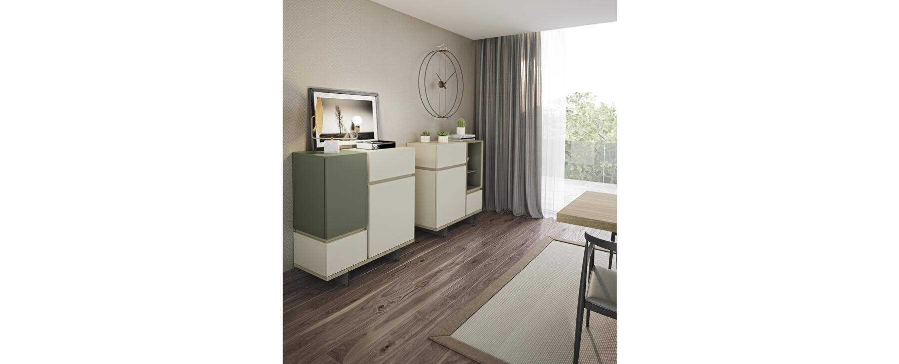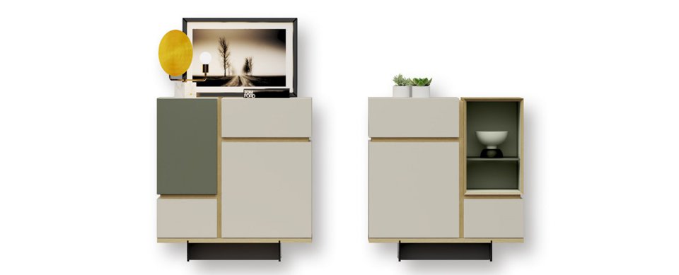 Los herrajes utilizados permiten nivelar las composiciones con precisión y garantizan una excelente funcionalidad en cajones y puertas. Además, existe la opción de colgar los aparadores en la pared, una solución innovadora dentro de este tipo de mobiliario.