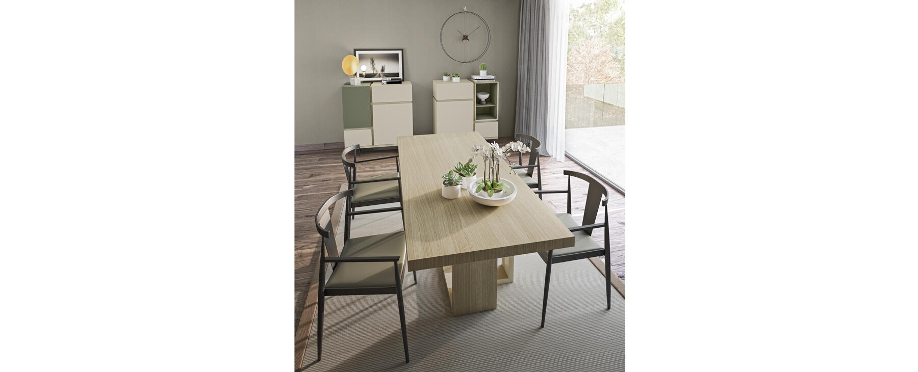 Todos los módulos de cajones y puertas destacan por su unión a 45 grados entre el sobre y el frente, un detalle constructivo que marca la diferencia y añade un plus de calidad al acabado final. Los módulos diáfanos, tanto en madera como en cristal, refuerzan esta sensación de calidad y aportan contraste, ligereza visual y un mayor componente de diseño.