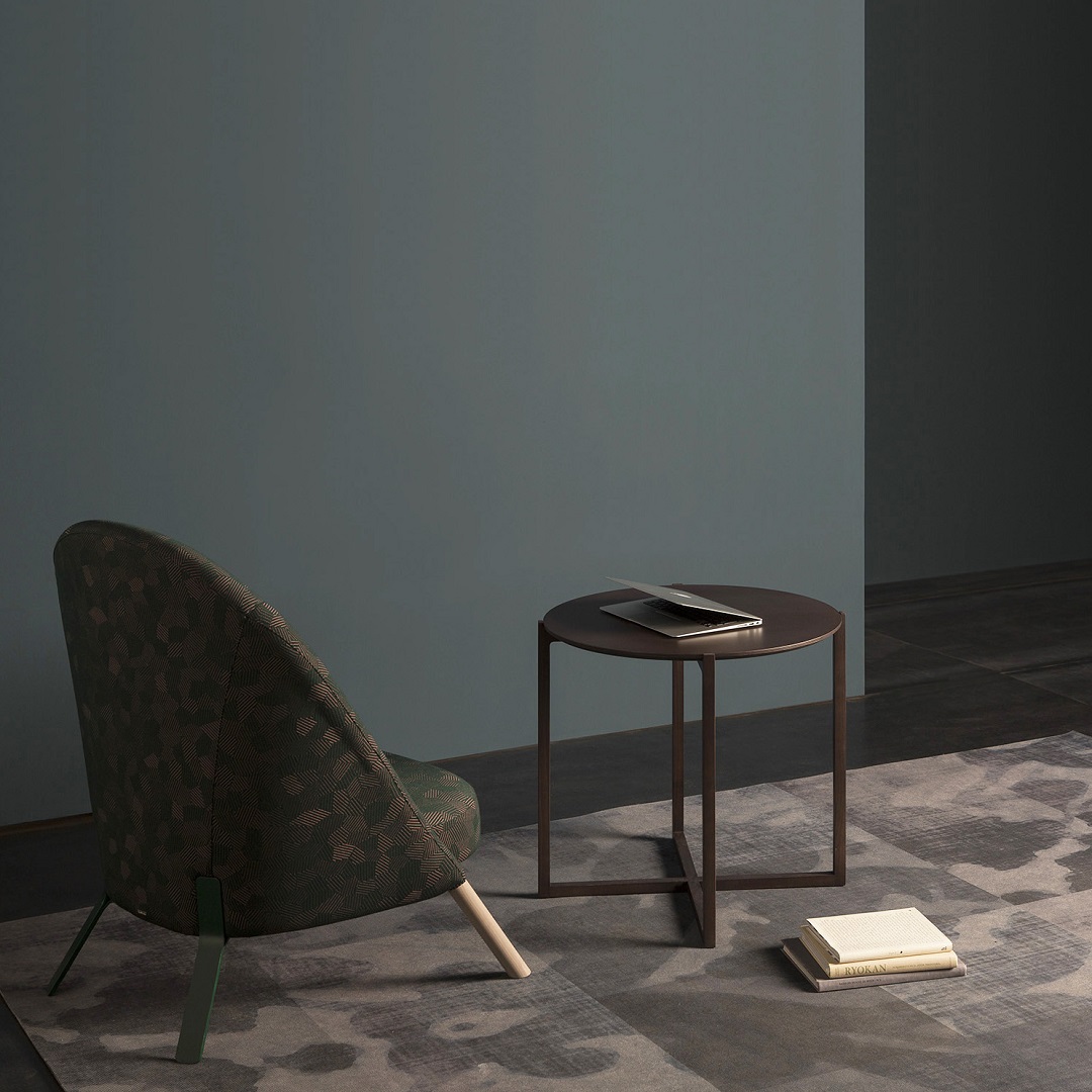 Lotta es una mesa auxiliar compuesta por tapa circular realizada en mármol o tablero de MDF chapada en nogal, y patas de madera maciza de nogal. Diseño de Estudio Arola para Kendo Mobiliario.