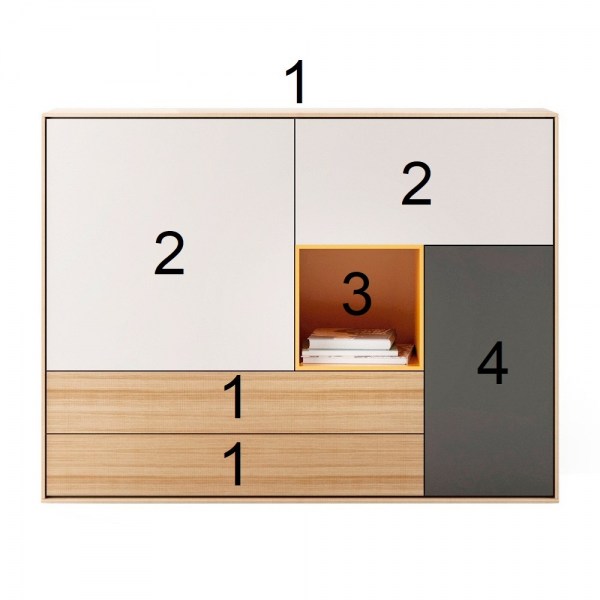 Aparador Aura 10 bajo con estructura, módulos y cajones, de madera o lacados con diferentes colores a elegir. Dimensiones: 132x47x102h cm. Diseñado por Angel Martí & Enrique Delamo para Treku.