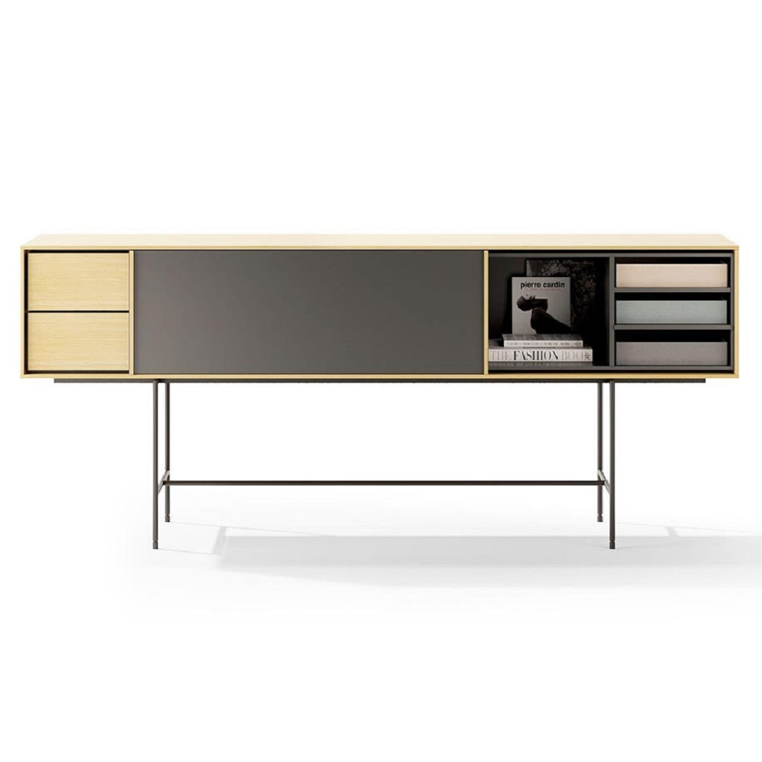 Aparador Aura 9 con diseño nórdico de estructura, módulos y cajones, con puertas correderas con cristal negro, de madera o lacados con diferentes colores a elegir y pies altos. Dimensiones: 196x47x82h cm. Diseñado por Angel Martí & Enrique Delamo para Treku.