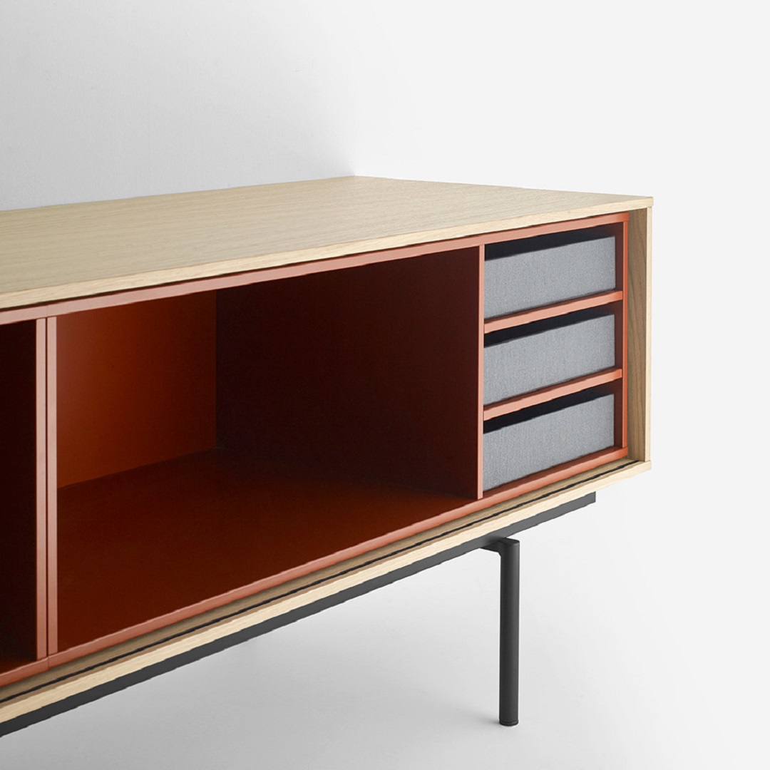 La colección Aura ha sido concebida como un programa para configurar principalmente aparadores y muebles para las zonas de salón comedor. Su diseño está inspirado en tiempos pasados y bajo la influencia de la cultura del diseño de los países nórdicos, que han sabido unir tradición y naturalidad con grandes dosis de modernidad. El resultado: una colección llena de memoria que desprende un aura muy actual. Los pies metálicos diseñados especialmente para la colección refuerzan esa imagen retro atemporal. Especial importancia tienen los acabados seleccionados: la madera de nogal y roble con una acabado hiper-natural y los lacados que combinan perfectamente entre sí con las maderas.