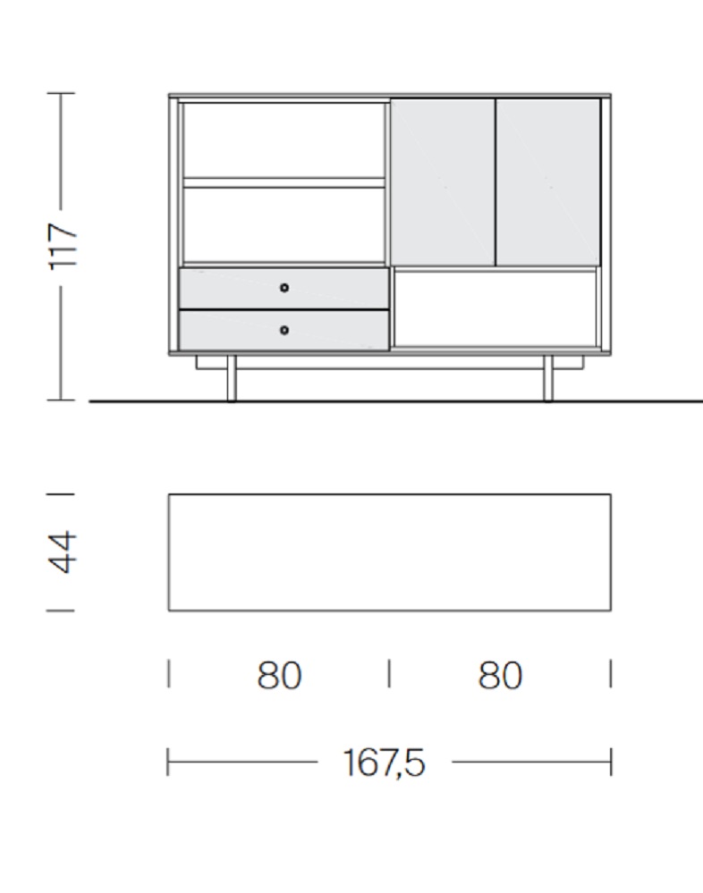 Aparador Moss 12 con estructura, hueco con estantes y cajones, lacados con diferentes colores a elegir. Dimensiones: 167,5x44x117h cm.