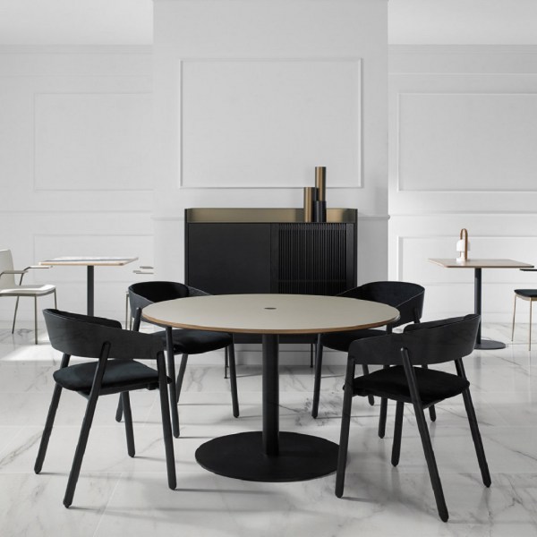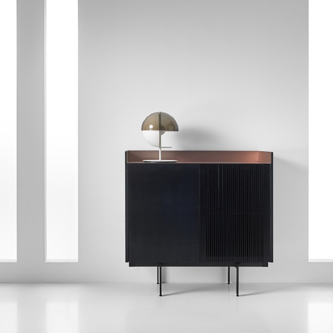 Colección de aparadores, cómodas y muebles de televisión ganadores del premio Red Dot 2015 con un singular acabado de aluminio en la parte superior y puertas lisas o listonadas. Mueble muy diverso, con diferentes opciones, apoyado sobre zócalo, pies regulables en dos opciones de medidas o con herraje opcional colgado a pared. Los elementos de puertas incluyen estante regulable en altura y pasacables.