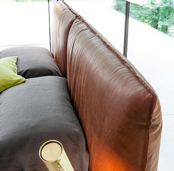 Cama Acolchada de Devina Nais, tapizada en eco piel o cuero, con varios colores a elegir. Los dos grandes cojines del cabecero actúan como telón de fondo del suave armazón de la cama. La medida del cabecero de 180 cm. es individual cosido en el centro.