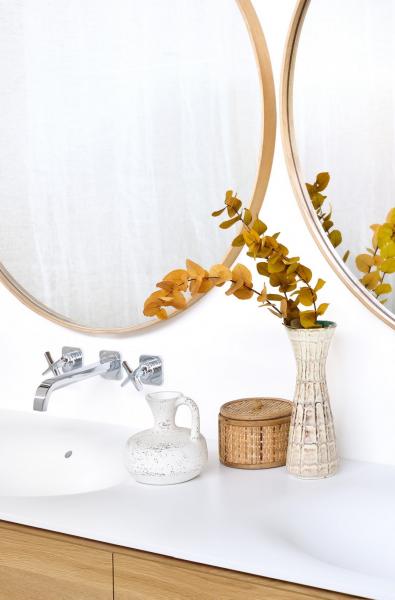 Bordes de roble y redondez perfecta: el espejo Layers se combinará y se destacará en cualquier entorno de baño. Todas las piezas de la Colección de baño Ethnicraft, incluidos los espejos y otros artículos adicionales, se han terminado con productos que cumplen los requisitos necesarios para su uso dentro de un área húmeda.