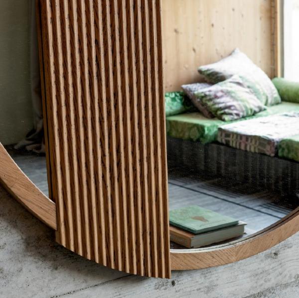 El espejo Zero.16 redondo, elegante y refinado, se caracteriza por la fusión de 2 elementos en roble macizo, uno liso y otro con el esquema típico gravado de la colección.