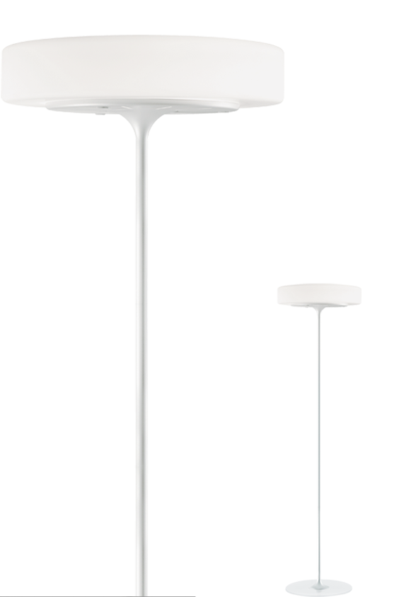 Lámpara de pie, estructura de metal barnizado blanco. Difusor de vidrio soplado y acidado.