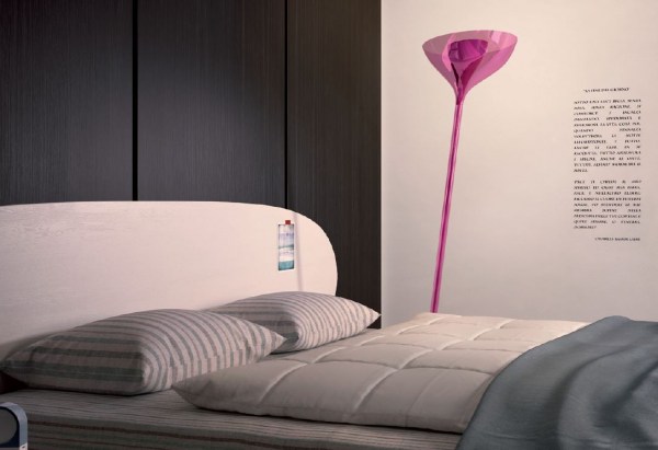 Lámpara de pie de luz indirecta de Plexiglás termoformado y extruido con reflector de aluminio torneado.