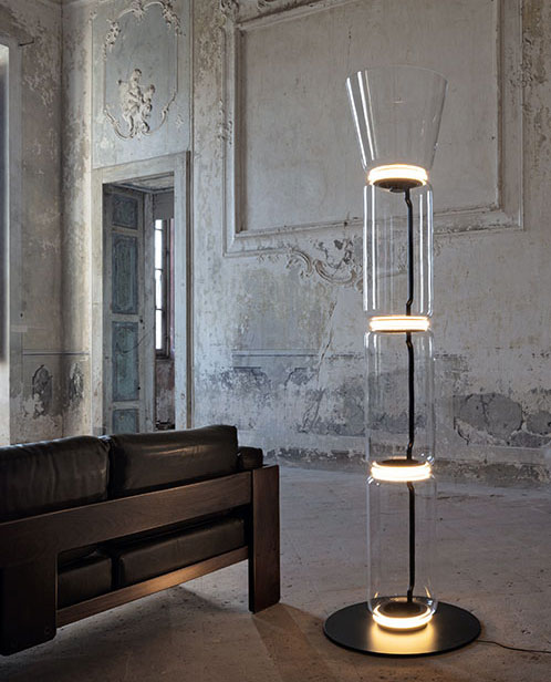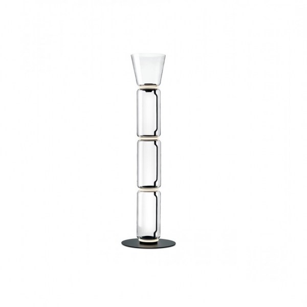 Lámparas de suelo compuestas por módulos de vidrio que se conectan entre sí hasta alcanzar una altura de 2,17 metros (85.43"). Cuerpo cilíndrico y semi-esfera de vidrio soplado transparente, base y anillos de aluminio fundido, brazos laterales internos de acero hidroconformado y difusores externos con anillo de silicona óptico opalino moldeado por inyección. La longitud del cable de alimentación es de 2 metros (78.74") con pedal, que permite regular la intensidad del 10% al 100% y viceversa. Alimentador de pared con enchufes intercambiables