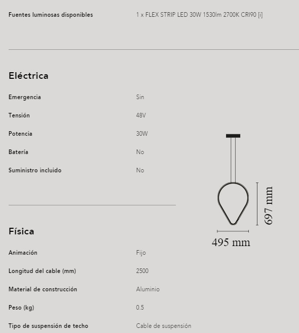 Luminaria de suspensión con emisión de luz difusa. Cuerpo de aluminio extruido, curvado, trabajado con CN y lacado negro en polvo, difusor de silicona óptica de platino. Todos los elementos se pueden conectar a la alimentación a través de un sistema de conexión eléctrico y mecánico diseñado para permitir crear configuraciones personalizadas del producto. Rosetones eléctricos disponibles con dos potencias: lámpara con potencia inferior a 70 W y lámpara con potencia inferior a 190 W. Disponibles también rosetones eléctricos de clase III para instalaciones con suministro eléctrico remoto: versión "de superficie" en el caso de instalaciones en cemento, versión "empotrada" para techos de yeso. El sistema electrónico integrado en el rosetón eléctrico permite utilizar sistemas de atenuación de la luz: push, 1-10, potenciómetro, DALI. En caso de ausencia de estos sistemas, se puede configurar el flujo luminoso, durante la fase de instalación, con el sistema push incluido en el rosetón. Longitud de los cables : 2,5 m