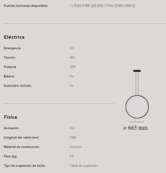 Luminaria de suspensión con emisión de luz difusa. Cuerpo de aluminio extruido, curvado, trabajado con CN y lacado negro en polvo, difusor de silicona óptica de platino. Todos los elementos se pueden conectar a la alimentación a través de un sistema de conexión eléctrico y mecánico diseñado para permitir crear configuraciones personalizadas del producto. Rosetones eléctricos disponibles con dos potencias: lámpara con potencia inferior a 70 W y lámpara con potencia inferior a 190 W. Disponibles también rosetones eléctricos de clase III para instalaciones con suministro eléctrico remoto: versión "de superficie" en el caso de instalaciones en cemento, versión "empotrada" para techos de yeso. El sistema electrónico integrado en el rosetón eléctrico permite utilizar sistemas de atenuación de la luz: push, 1-10, potenciómetro, DALI. En caso de ausencia de estos sistemas, se puede configurar el flujo luminoso, durante la fase de instalación, con el sistema push incluido en el rosetón. Longitud de los cables : 2,5 m