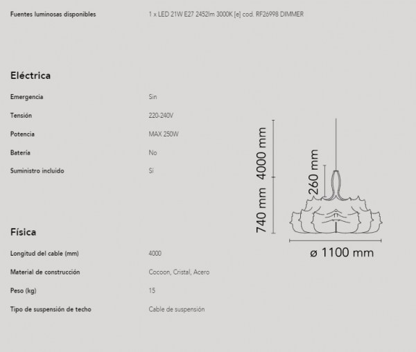 Lámpara Zeppelin de suspensión que proporciona iluminación difusa. Estructura interior en acero pintado en polvo blanco. Pantalla en resina "cocoon" pulverizada sobre la estructura, con película protectora transparente pulverizada al final. "Candelas" en polimetilmetacrilato (PMMA) transparente. Bola de cristal tallado para un efecto de luz centelleante, colocada en el centro de la parte inferior de la lámpara.