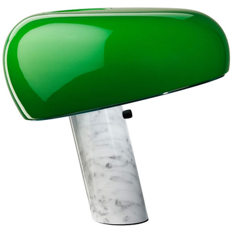 Lámpara de mesa de luz directa con reflector de metal esmaltado y base de mármol blanco.