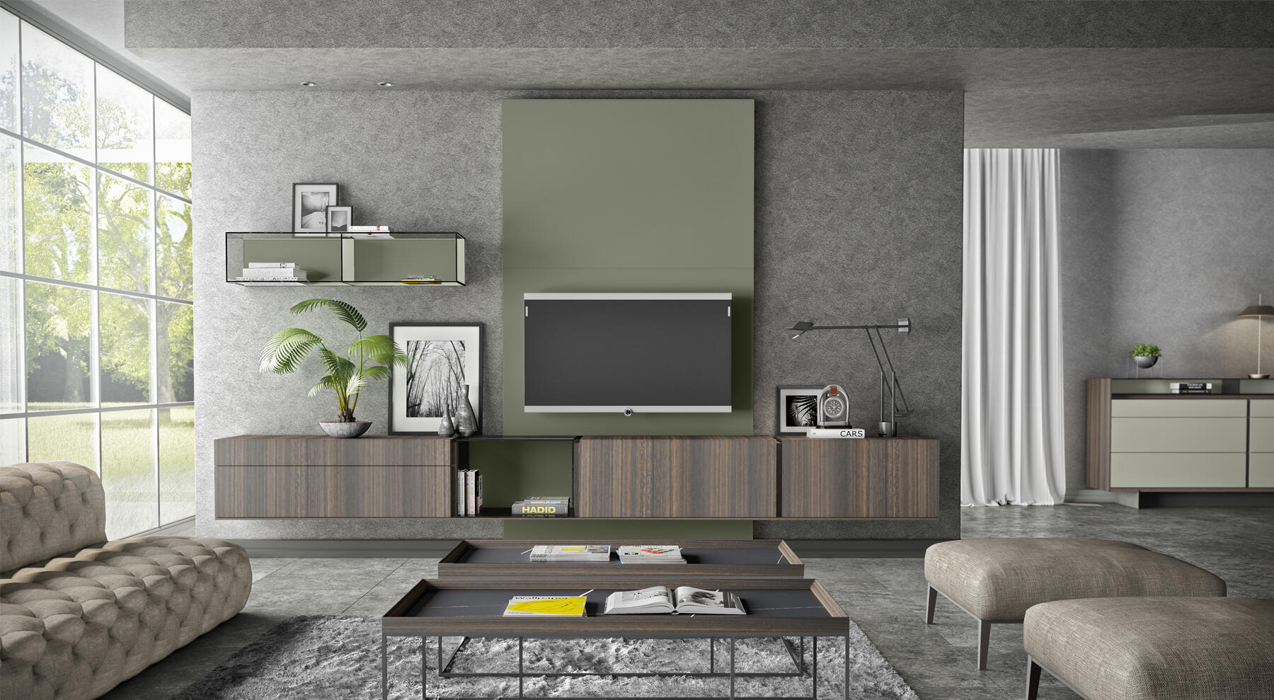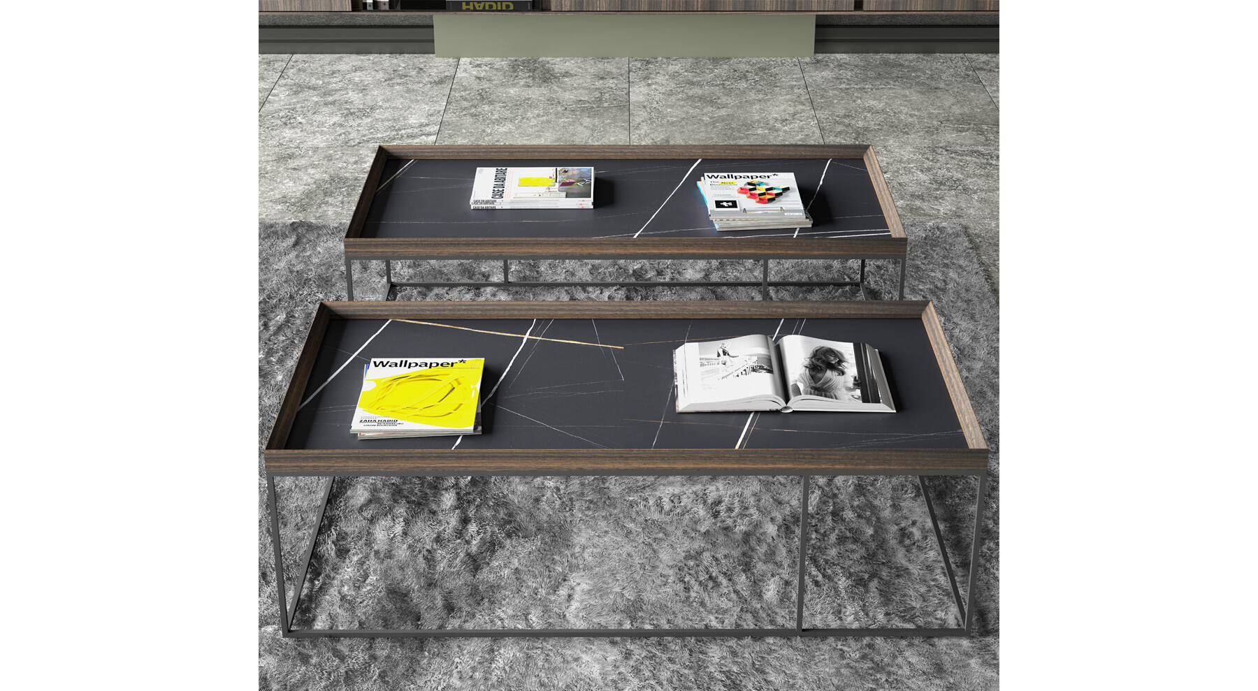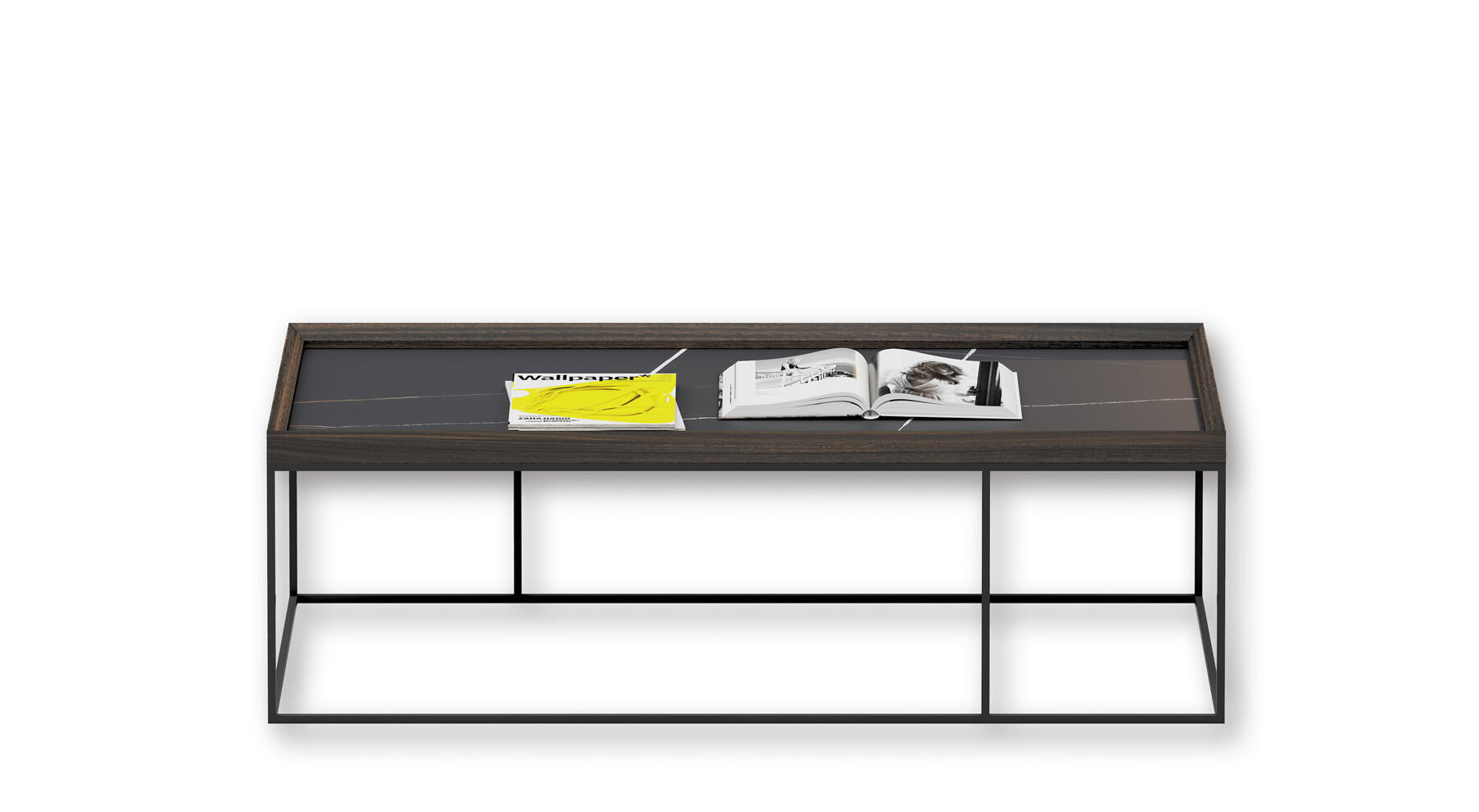 La mesa de centro KU-MARK permite, sobre una base metálica, la incorporación de un sobre recto de chapa o laca. Se ofrece en diferentes versiones totalmente compatible con los aparadores y módulos de televisión de EMEDE