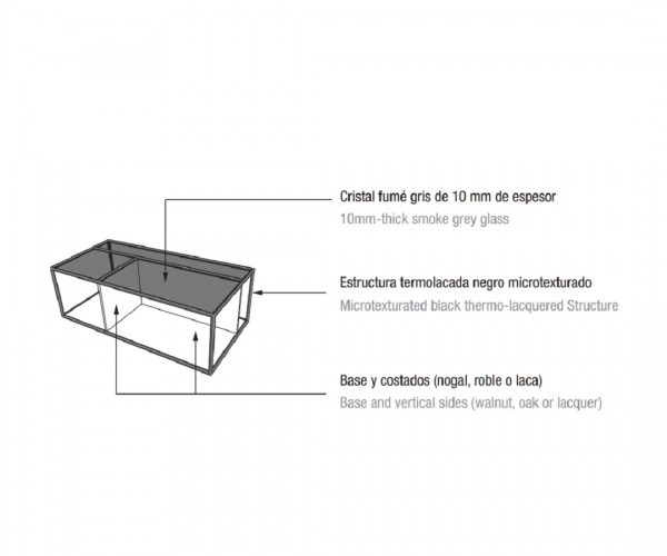 La mesa de centro Rita está compuesta por un sobre de cristal fumé gris (10 mm), costados verticales y base en laca, nogal o roble a elegir color y una estructura metálica termo lacada en negro microtexturado o en laca en varios colores a escoger. Diseño de Antoni Arola para Kendo Mobiliario.