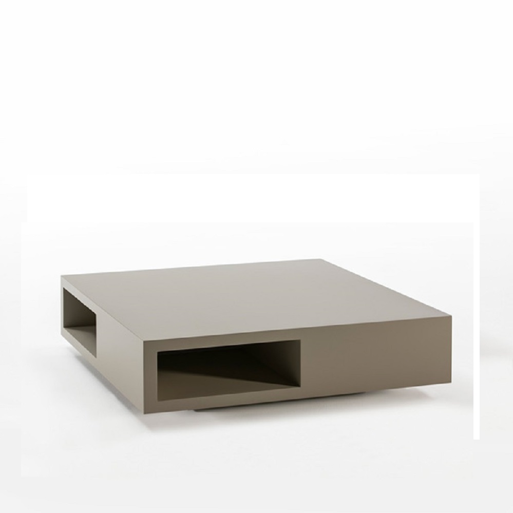 La mesa de centro Vera está lacada. Los huecos pueden ir en tres acabados de chapa o lacados en el mismo o diferente color que la mesa Diseño de Antoni Arola para Kendo Mobiliario.