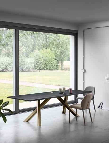 Cuatro líneas cruzadas que soportan un top disponible en varios acabados que lo hacen ideal para una decoración que sorprende. Las patas se obtienen de metal doblado a presión, mientras que la parte superior está disponible fija o extensible (Gustave Plus). Versión extensible de la mesa de comedor Gustave. El perímetro de la parte superior se caracteriza por un corte a 30 ° que ayuda a ocultar visualmente las extensiones, una vez cerradas. También disponibles bordes naturales para algunos acabados de madera.