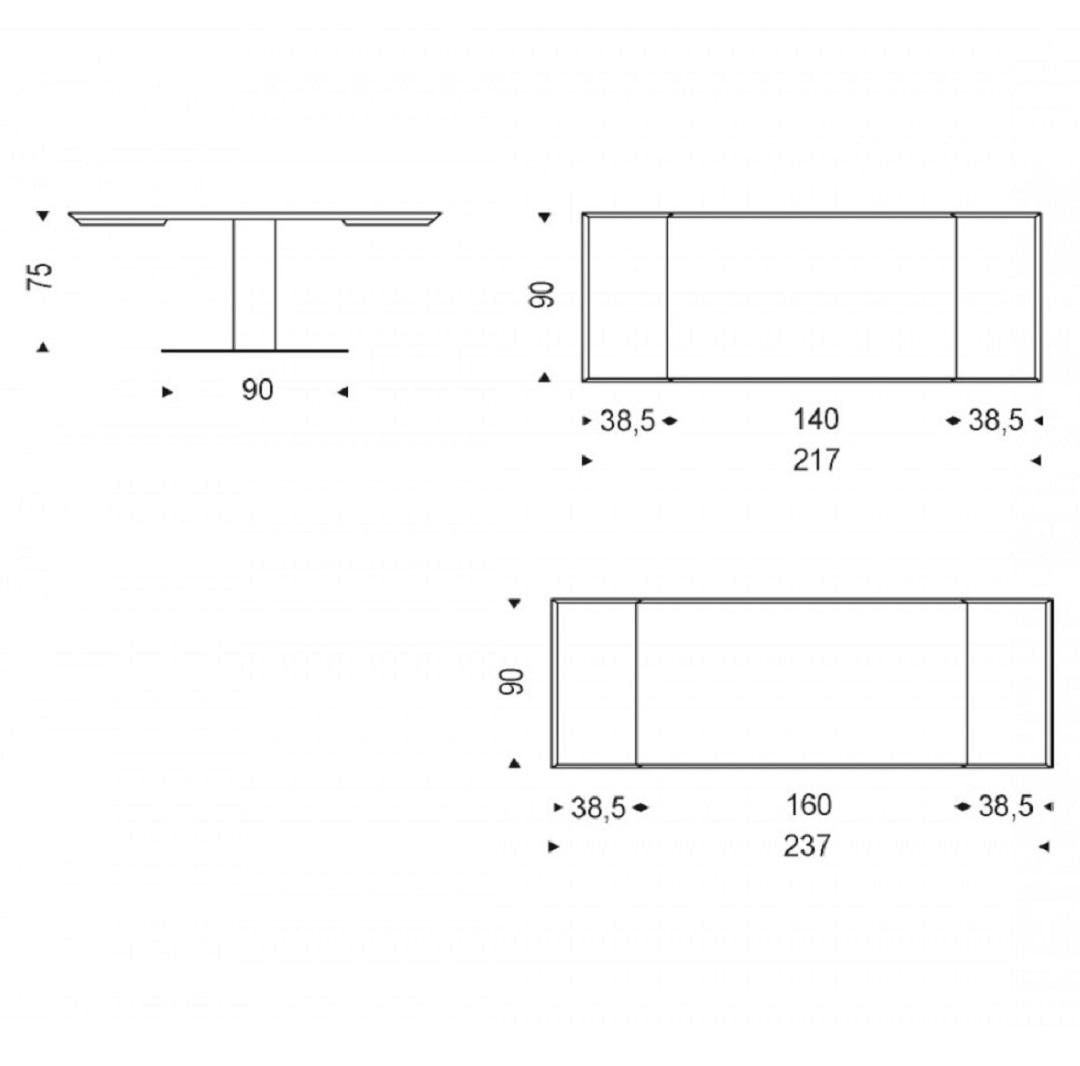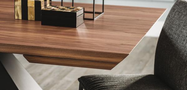 Mesa extensible con base en acero inox satinado y columna en acero inox brillo o barnizado gofrado titanio (GFM11), graphite (GFM69) o blanco (GFM71). Sobre y extensiones en madera nogal Canaletto (NC) o roble ahumado (RB).