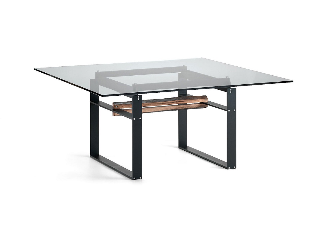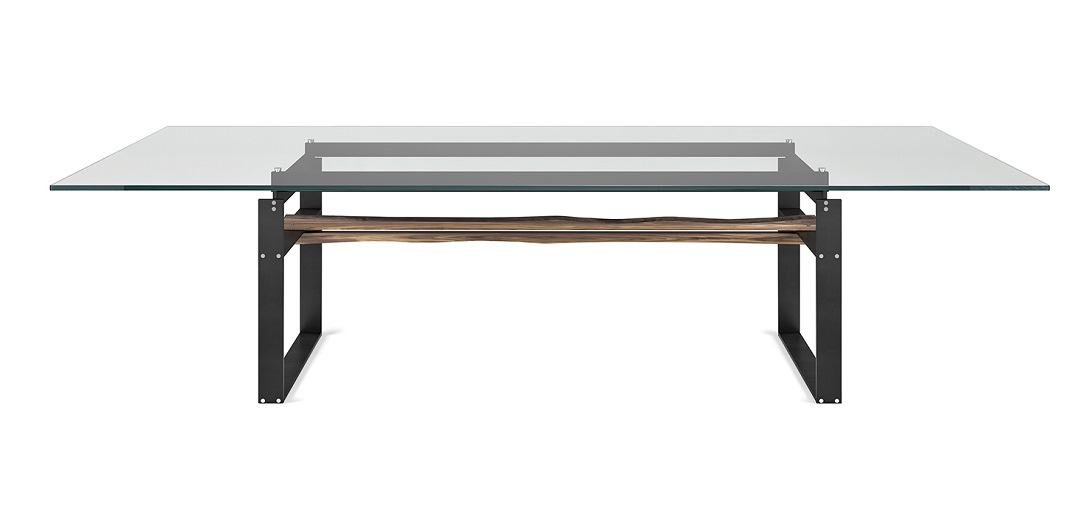 Mesa con base en acero barnizado gofrado graphite (GFM69), blanco (GFM71) o negro (GFM73) y viga central en macizo natural de nogal Canaletto (NC) o acero barnizado gofrado graphite (GFM69), blanco (GFM71) o negro (GFM73). Sobre en cristal transparente o transparente extraclaro 15mm. Sobre en apoyo.
