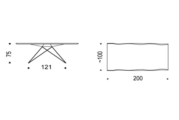 Mesa con base en acero barnizado gofrado titanio (GFM11), bronce (GFM18), graphite (GFM69) o negro (GFM73). Sobre en madera nogal Canaletto (NC), roble ahumado (RB) o roble natural (RN) con bordes irregulares en macizo.