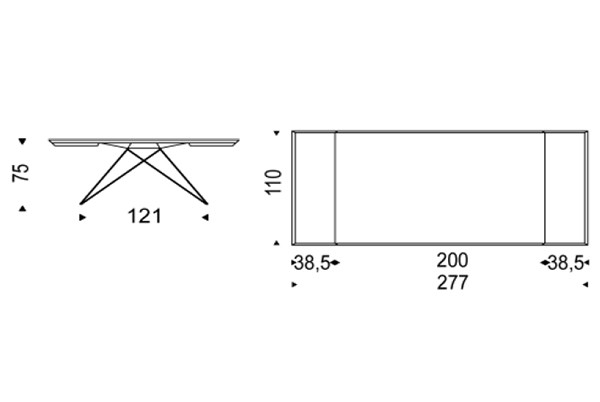 Mesa extensible con base en acero barnizado gofrado titanio (GFM11), bronce (GFM18), graphite (GFM69) o negro (GFM73). Sobre y extensiones con bordes oblicuos en madera nogal Canaletto (NC) o roble ahumado (RB).