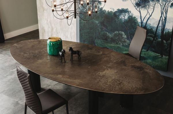 Mesa con base en acero gofrado titanio (GFM11) o negro (GFM73) y detalles en acero cromo negro (06). Sobre en cerámica Marmi colores Calacatta (KM01), Alabastro (KM02), Ardesia (KM04), Golden Calacatta mate (KM05), Golden Calacatta brillo (KM06), Portoro mate (KM07), Portoro brillo (KM08), Sahara Noir brillo (KM09), Emperador (KM10), Makalu (KM11) o cerámica Brown Zinc (KZ01). Versión 3 con 1 pata grande y 2 patas pequeñas, versión 4 con 2 patas grandes y 2 patas pequeñas. Opcional pata pequeña.