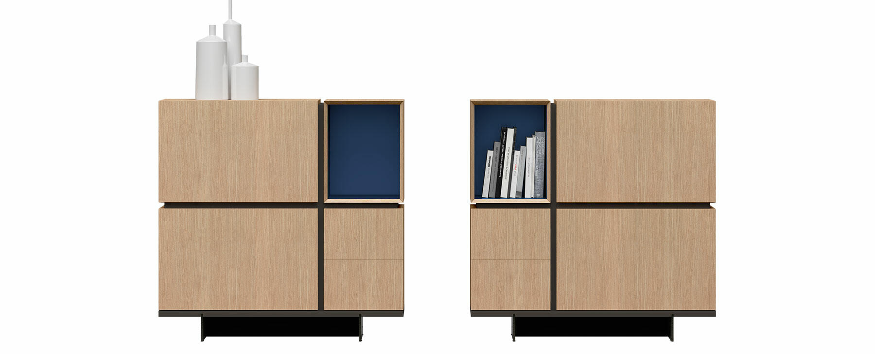 Los aparadores de EMEDE se distinguen por su total capacidad de personalización. A partir de cuatro modelos base, con o sin patas, es posible combinar elementos apilables como cajones, puertas, módulos diáfanos de madera y diáfanos de cristal. La única regla es utilizar una pieza de unión como conector entre los distintos elementos. Esta pieza es el corazón del sistema y la que aporta identidad al programa, un concepto que también se aplica en las estanterías y en los muebles de televisión.