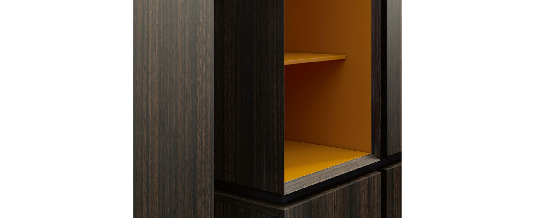 Todos los módulos de cajones y puertas destacan por su unión a 45 grados entre el sobre y el frente, un detalle constructivo que marca la diferencia y añade un plus de calidad al acabado final. Los módulos diáfanos, tanto en madera como en cristal, refuerzan esta sensación de calidad y aportan contraste, ligereza visual y un mayor componente de diseño.