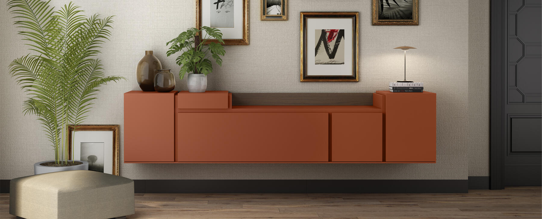 Los herrajes utilizados permiten nivelar las composiciones con precisión y garantizan una excelente funcionalidad en cajones y puertas. Además, existe la opción de colgar los aparadores en la pared, una solución innovadora dentro de este tipo de mobiliario.