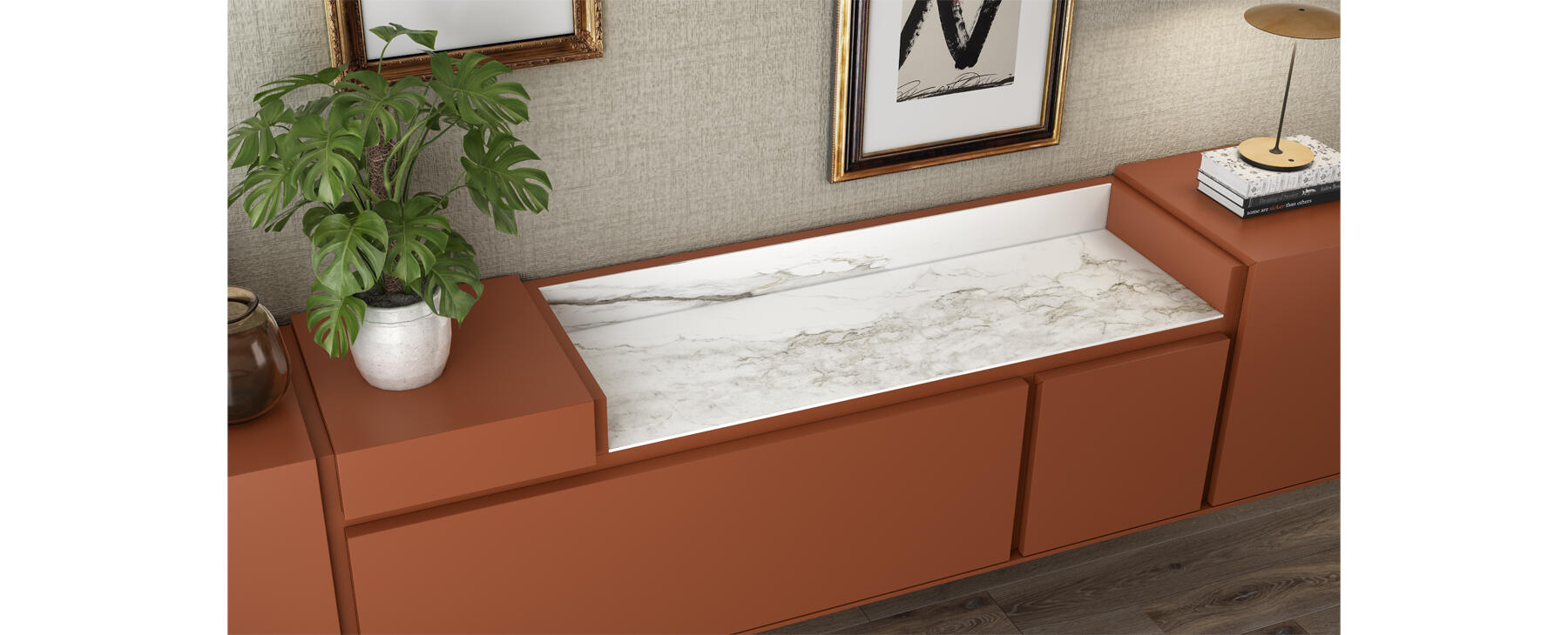 Todos los módulos de cajones y puertas destacan por su unión a 45 grados entre el sobre y el frente, un detalle constructivo que marca la diferencia y añade un plus de calidad al acabado final. Los módulos diáfanos, tanto en madera como en cristal, refuerzan esta sensación de calidad y aportan contraste, ligereza visual y un mayor componente de diseño.