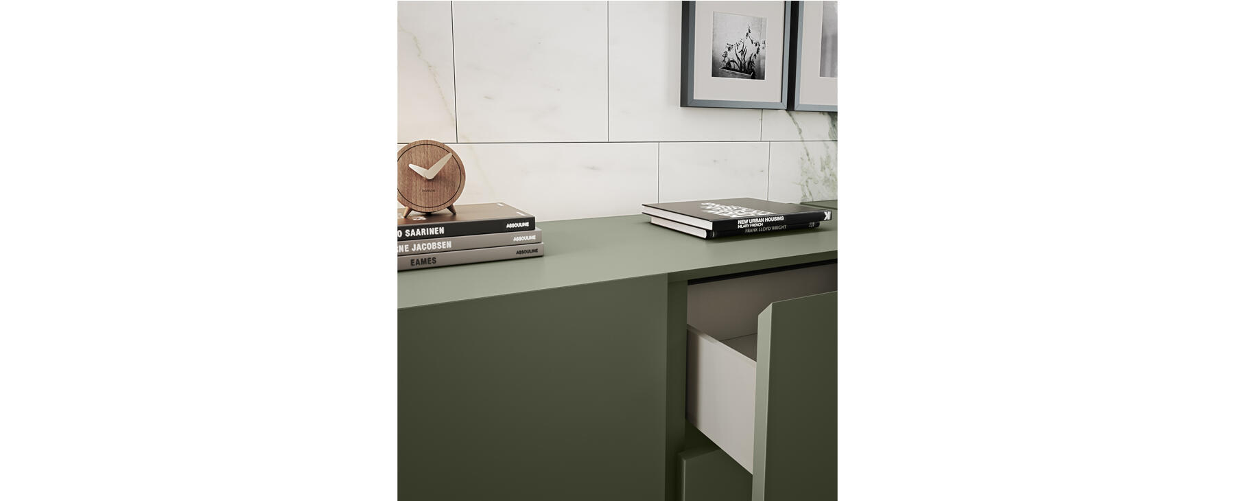 Todos los módulos de cajones y puertas destacan por su unión a 45 grados entre el sobre y el frente, un detalle constructivo que marca la diferencia y añade un plus de calidad al acabado final. Los módulos diáfanos, tanto en madera como en cristal, refuerzan esta sensación de calidad y aportan contraste, ligereza visual y un mayor componente de diseño.