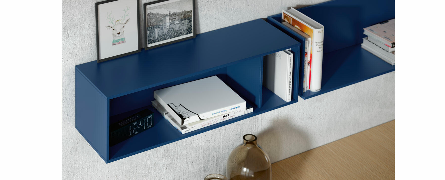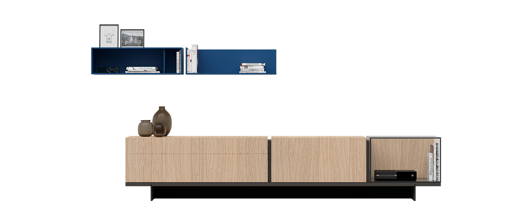 Los Muebles de Televisión de EMEDE se basan en la total personalización. Sobre cuatro modelos de base disponibles, con patas o sin patas, se apilan elementos de cajones, puertas, diáfanos de madera y diáfanos de cristal. Sólo existe una regla, y es que para unir dichos elementos, una pieza de unión se use como conector. Dicha pieza es la base del sistema y la que le aporta la personalidad a este programa de muebles de televisión.