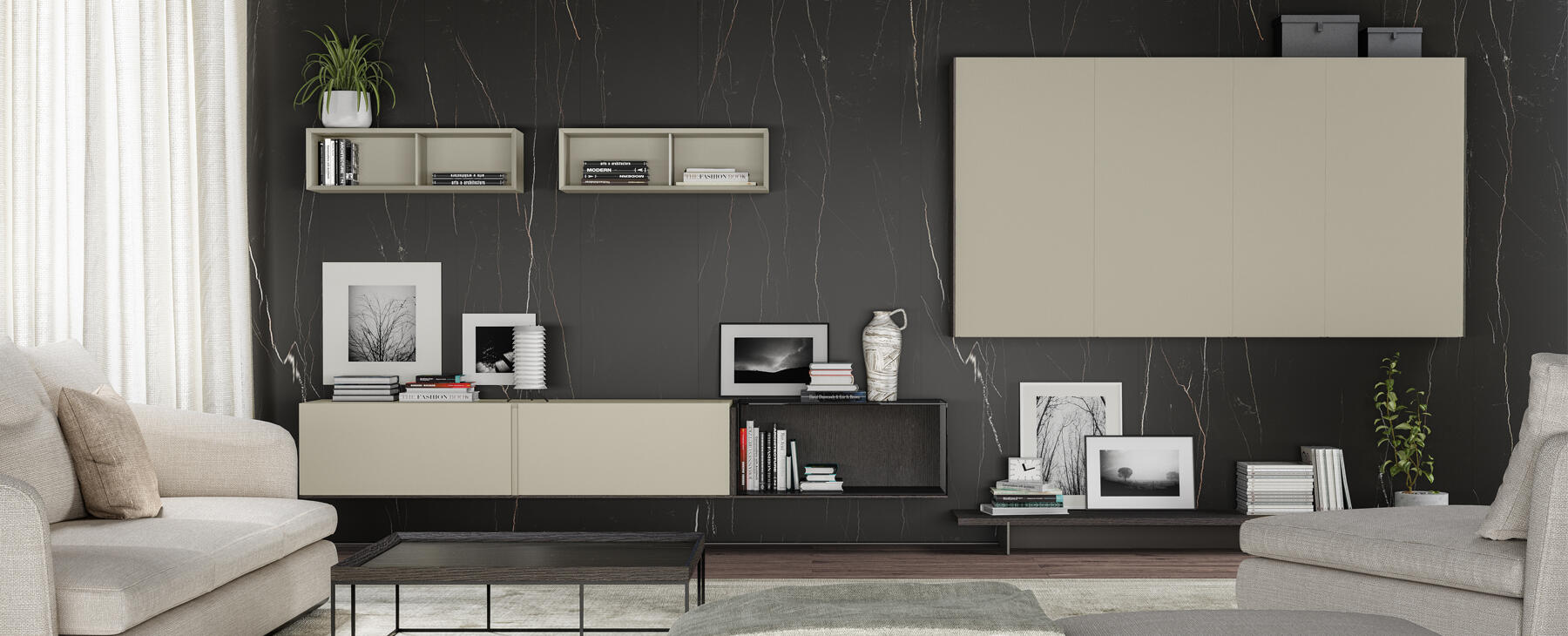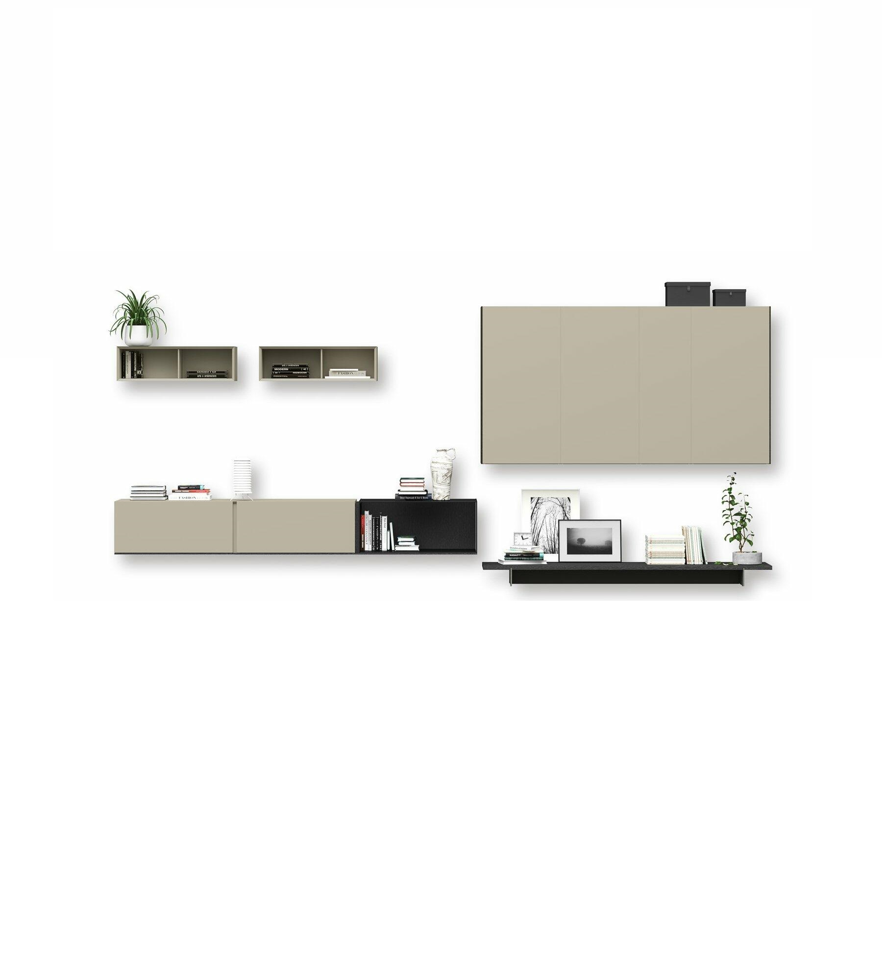 Composición salón y mueble TV. Disponible en otros acabados, medidas y formas. Precios base acabados laca mate, consultar incrementos en otros acabados y medidas.