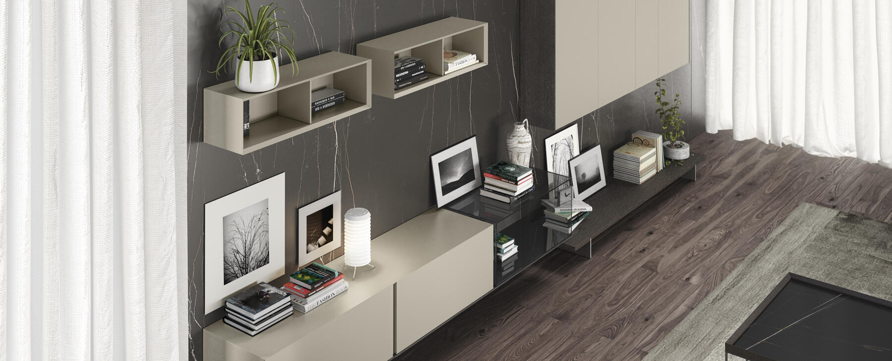 Todos los elementos de cajones y puertas se basan en una unión perfectamente ejecutada a 45 grados entre el sobre y el frente del módulo. Se trata de un detalle diferencial de este mobiliario que le aporta un plus de calidad al resultado final. Los elementos diáfanos de madera y de cristal aportan asimismo un plus de calidad y de contraste que permite aligerar las composiciones aportando un plus de diseño.