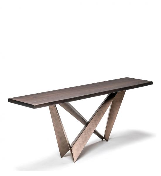 Consola con base en acero barnizado gofrado titanio (GFM11), bronce (GFM18), graphite (GFM69), pearl (GFM70), negro (GFM73), Brushed Bronze o Brushed Grey. Sobre en cristal 12mm transparente, transparente extraclaro o de madera nogal Canaletto (NC), roble ahumado (RB) o roble natural (RN) con borde irregular en macizo. Ajuste a la pared necesario.