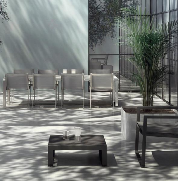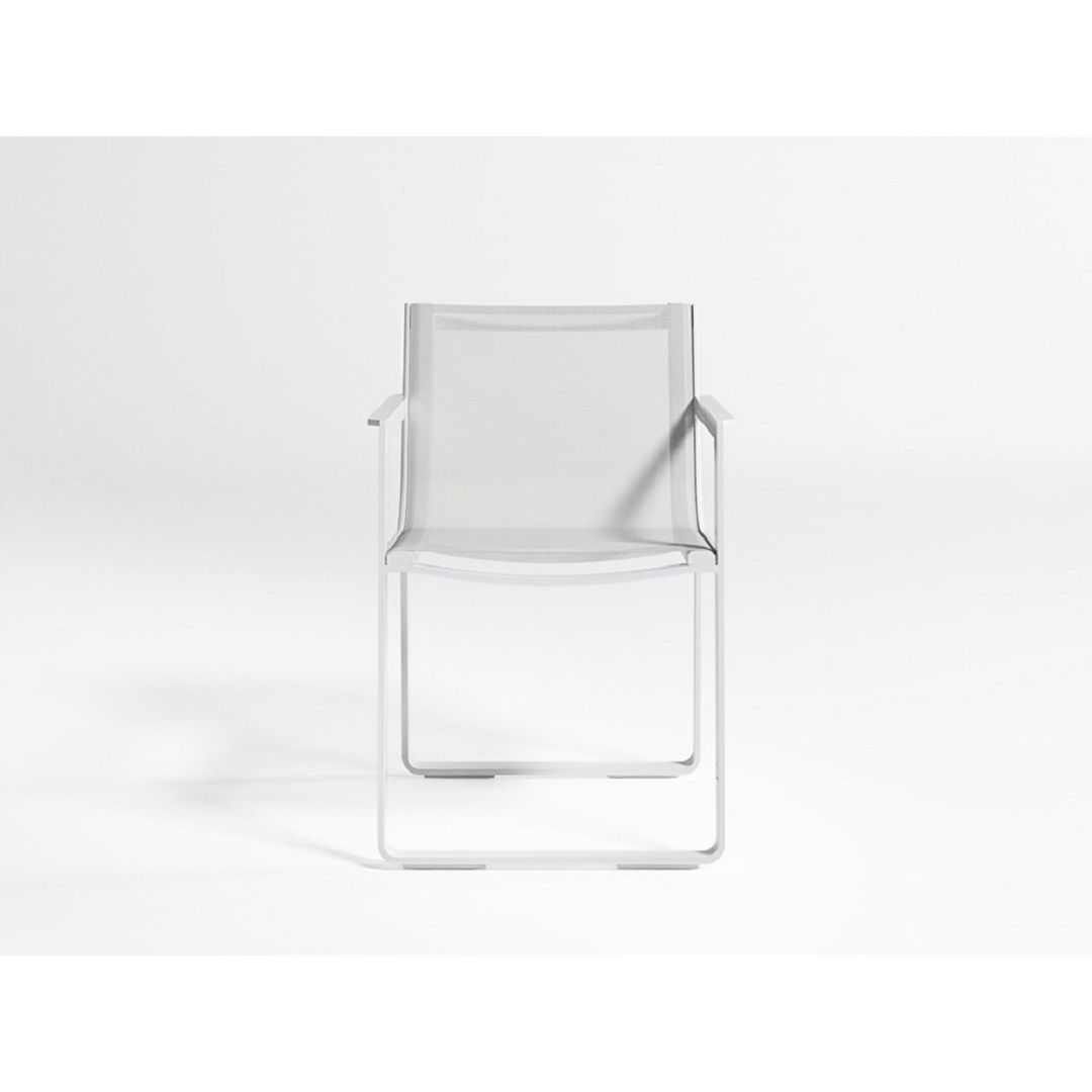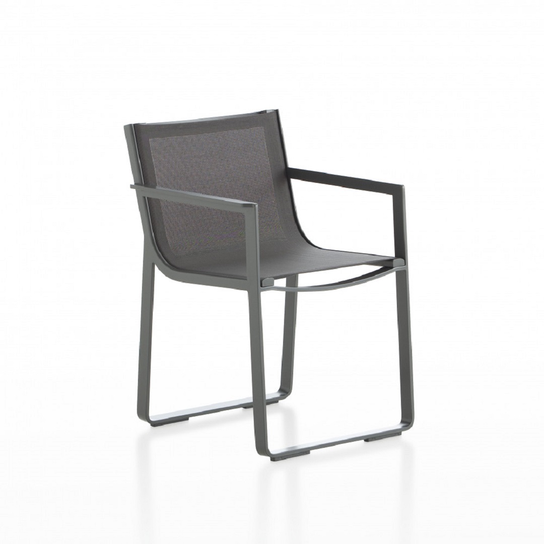Silla con brazos Flat de exterior de aluminio soldado termolacado y tela Batyline® del diseñador Mario Ruiz. Dimensiones: 54x58x43h cm.