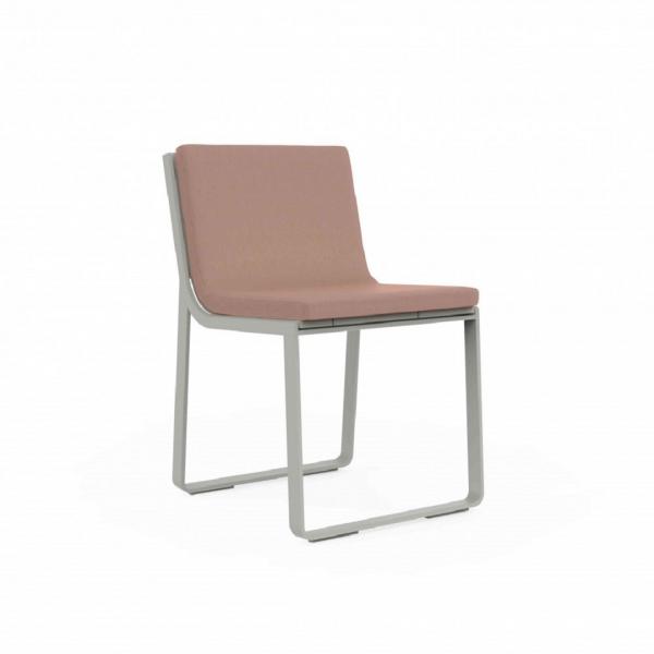 La silla Flat se adapta a tus necesidades. Es una silla de exterior fabricada con perfilería de aluminio soldado termolacado y polietileno 100% reciclable. La confortabilidad la aportan los cojines de gomaespuma de poliuretano recubierta con tejido hidrófugo que puedes personalizar, escogiendo las texturas y colores que prefieras.